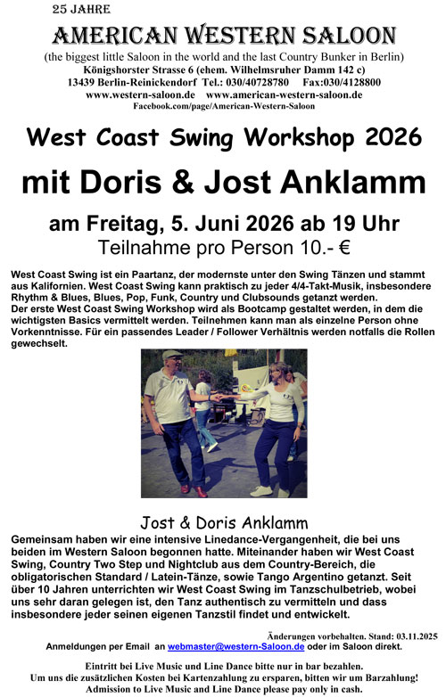 Eintritt bei Live Music und Line Dance bitte nur in bar bezahlen. Admission to Live Music and Line Dance please pay only in cash.